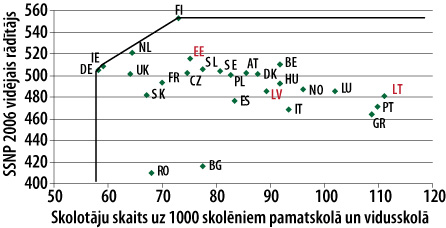 Savukārt 1. b attēls parāda, ka vidējie skolēnu mācību sasniegumi nav atkarīgi no skolotāju un skolēnu skaita attiecības. Jāpiebilst, ka, neraugoties uz relatīvi zemiem izdevumiem izglītībai, skolotāju un skolēnu skaita attiecība Latvijā salīdzinājumā ar citām ES valstīm ir vidēji augsta, tātad Latvijai piemīt augsta izmaksu efektivitāte (cost efficiency). ES nepastāv sakarība starp skolotāju un skolēnu skaita attiecību un iedzīvotāju blīvumu, tādējādi, samērā zemais iedzīvotāju blīvums Latvijā nav augstās skolotāju un skolēnu attiecības noteicošais faktors. Savukārt augstais skolotāju blīvums Latvijā neatspoguļojas skolēnu mācību sasniegumos, kas liecina par zemu sistēmas efektivitāti (system efficiency). Augstu izmaksu efektivitāti lielā mērā nosaka zemas izglītības infrastruktūras uzturēšanas un mācībspēku atalgojuma izmaksas, bet pati izglītības sistēma nav efektīva, kas norāda uz tās efektivitātes uzlabošanas iespējām. Lai precīzi identificētu sistēmas neefektivitātes cēloņus Latvijā, jāizpēta to valstu pieredze, kuras efektivitātes ziņā ir mums priekšā.