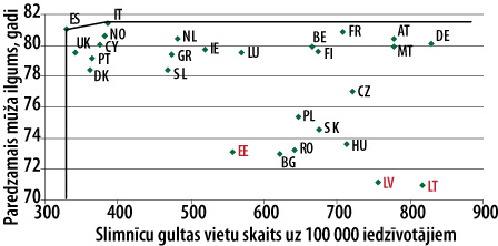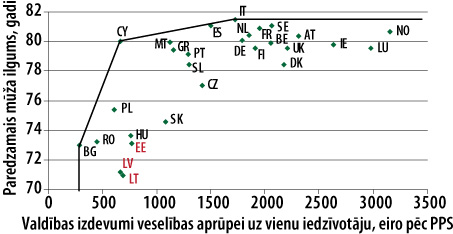 Novērtējot veselības aprūpes izdevumu efektivitāti, var izmantot gan tikai valdības, gan kopējos izdevumus (kas papildus iekļauj privātos izdevumus) veselības aprūpei, jo starp šiem rādītājiem ir ļoti cieša sakarība. Savukārt par rezultatīvo rādītāju izvēlēsimies paredzamo mūža ilgumu, bet līdzīgus rezultātus iegūst, ja izmanto veselīgā vidējā mūža ilgumu (healthy average life expectancy). Kā redzams 2. a attēlā, Latvijā mūža ilgums ir otrais īsākais ES pēc Lietuvas, turklāt Latvija atrodas pietiekami tālu no līnijas, kura savieno efektīvās valstis (Bulgāriju, Kipru un Itāliju), kas varētu liecināt par zemu veselības aprūpes izdevumu efektivitāti (Latvija efektivitātes ziņā atrodas 27. vietā). Līdzīgi kā izglītības jomā, arī veselības aprūpes jomā ir augsta izmaksu efektivitāte un zema veselības aprūpes sistēmas efektivitāte (salīdzinoši daudz slimnīcu gultas vietu un ārstu, bet zems mūža ilgums; sk. 2. b attēlu). Tas varētu liecināt par slimnīcu gultas vietu zemu produktivitāti, neefektīvu slimnīcu tīklu vai liekām gultas vietām noteikta profila slimnīcās. Lai precīzi noskaidrotu zemās efektivitātes cēloņus Latvijā, jāizpēta citu valstu pieredze un jāizmanto plašāki slimnīcu dati. Tāpat kā skolotāju un skolēnu skaita attiecība arī ārstu un slimnīcu gultu vietu skaits ES ietvaros nekorelē ar iedzīvotāju blīvumu. Tādējādi zems iedzīvotāju blīvums Latvijā nav veselības aprūpes sistēmas zemas efektivitātes noteicošais faktors.
