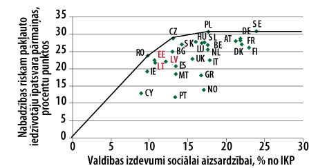 Novērtējot valdības izdevumu efektivitāti sociālajā aizsardzībā, jāatceras, ka sociālās aizsardzības mērķis ir nevis sasniegt ienākumu vienlīdzību, bet samazināt ienākumu nevienlīdzību līdz kādam noteiktam līmenim. Savukārt ienākumu nevienlīdzības optimālais līmenis dažādās valstīs var atšķirties. Tādējādi efektīvākā starp divām valstīm ar līdzīgu ienākumu nevienlīdzību būs valsts ar mazākiem izdevumiem sociālajai aizsardzībai. Kā redzams 4. attēlā, valdības izdevumi sociālajai aizsardzībai Latvijā relatīvi maz pasargā iedzīvotājus no nabadzības riska3 pat salīdzinājumā ar pārējām Baltijas valstīm. ES valstu vidū Latvija efektivitātes ziņā ir 20. vietā. Pie līdzīga secinājuma nonāk, par rezultatīvo rādītāju izvēloties arī citus ienākumu nevienlīdzības rādītājus. Sociālās aizsardzības efektivitātes jomā Latvijai būtu vērts izvērtēt Rumānijas, Čehijas, Igaunijas, Lietuvas un Īrijas pieredzi, tomēr jāatceras, ka, pirmkārt, šādi salīdzinājumi nav pietiekami, lai definētu, kādi tieši sociālie pabalsti nav efektīvi, lai samazinātu nabadzības risku, un, otrkārt, dažiem sociāliem pabalstiem ir cits mērķis, piemēram, paaugstināt dzimstību.