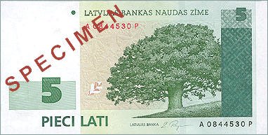 inscriptions PIECI LATI (five lats) in two-coloured print, LATVIJAS