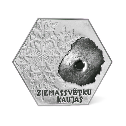 The left side of the reverse is covered with snowflakes, while the right one features a point of the bullet impact, with the inscription ZIEMASSVĒTKU KAUJAS (CHRISTMAS BATTLES) placed at the bottom.